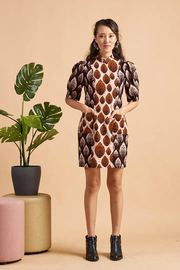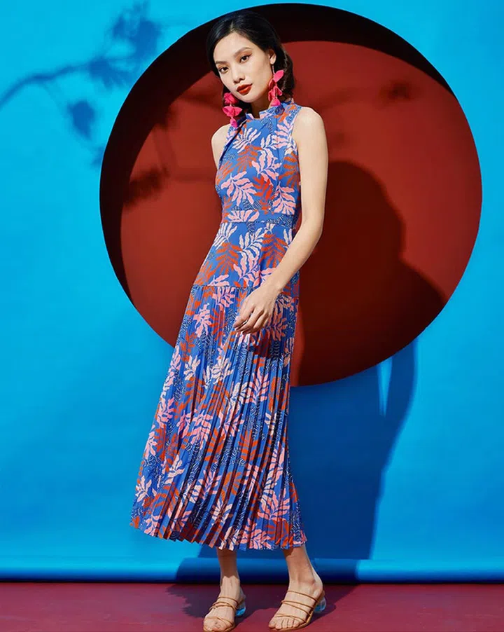 YeoMama时尚品牌由本地设计师Desleen Yeo于2018年成立,现今著名的Batik设计让所有人都爱不释手。这身贴身剪裁的无袖挂脖旗袍设计以精湛的剪裁以及独有的细节,让你穿出优雅腼腆女性的自信美。不说精湛的batik花纹,注意腰部上的折叠细节,经典的旗袍设计注入了创意元素,整体造型洋溢着青春的一番韵味。