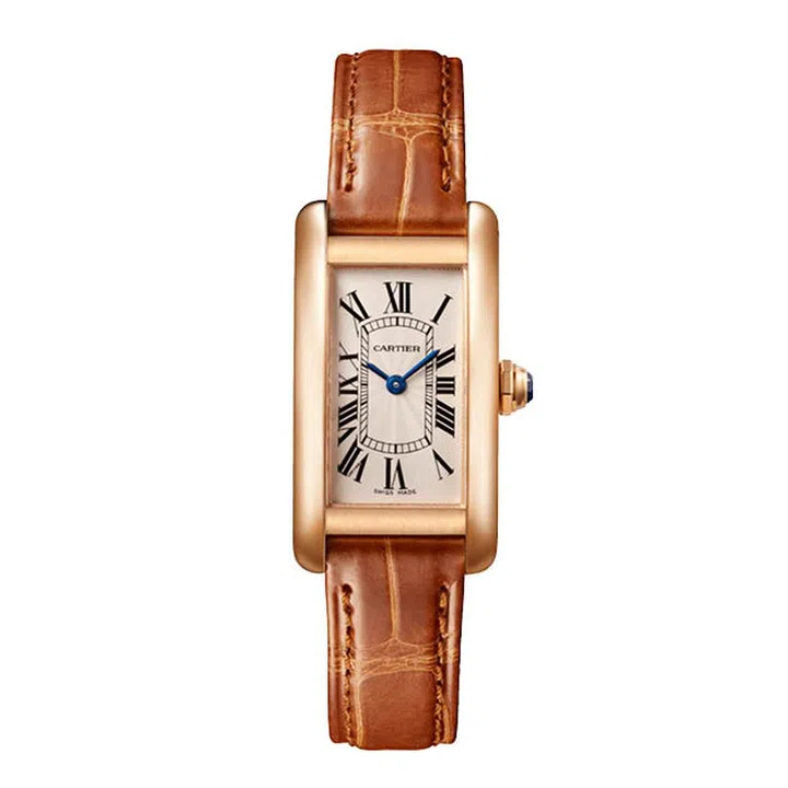 CARTIER Tank Américaine搭载石英机芯、34.8 x 19 mm 18K玫瑰金表壳、皮革表带小型腕表 $14,000