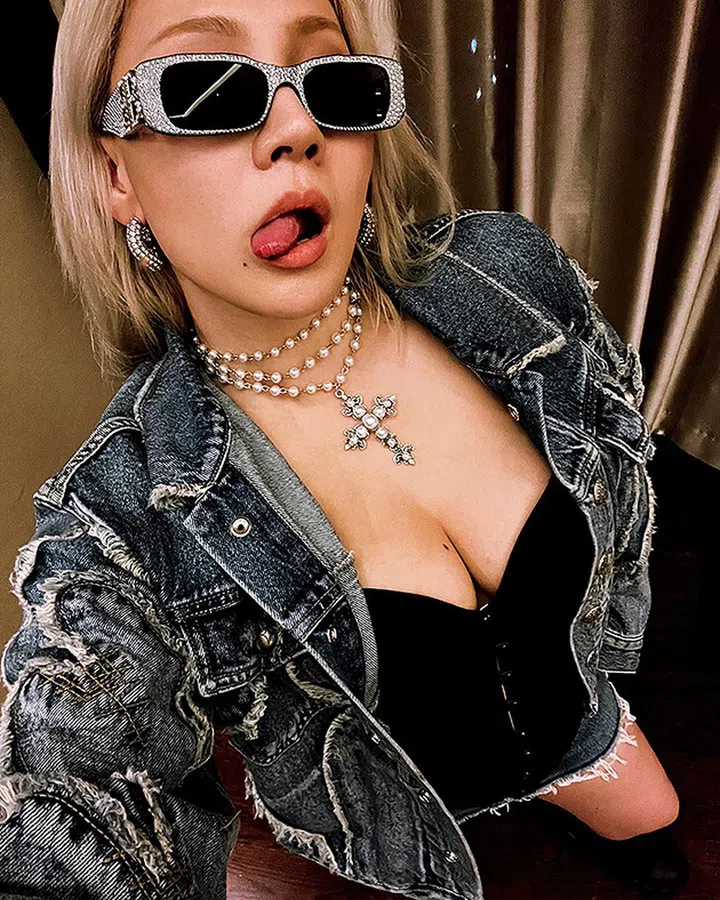 CL以风格粗犷的磨边牛仔夹克搭配珍珠元素十字架项链及璀璨墨镜等配饰,造型街头感十足,超有嘻哈酷味。内里可搭配黑色胸衣,以及同样磨边元素的短裙。
