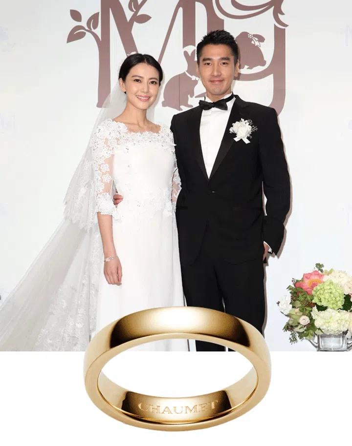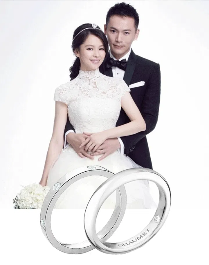 徐若瑄于2014年嫁给新加坡籍老公李云峰,婚照中的她身穿一袭古典蕾丝婚纱并戴上Chaumet冠冕,宛如童话里的公主。她曾在社交媒体分享,产后终于能戴回婚戒!与高圆圆夫妻同样选择了Chaumet Plume系列,但她的婚戒是镶有7颗钻石的铂金款式。