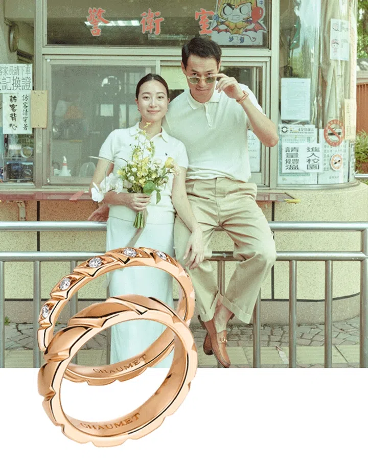 回顾三年前杨祐宁与老婆Melinda回到校园拍摄婚纱照,没有童话般的白纱及西装,简简单单的Polo衫也能感觉幸福和温馨!他们选择的婚戒也是简约风,虽然婚照服装休闲,可婚戒却一点都不简单。两人的婚戒来自Chaumet的Torsade玫瑰金戒指,通过戒环旋转缠绕的线条“重现”Vendome Column纪念圆柱的细节,寓意长久相伴。