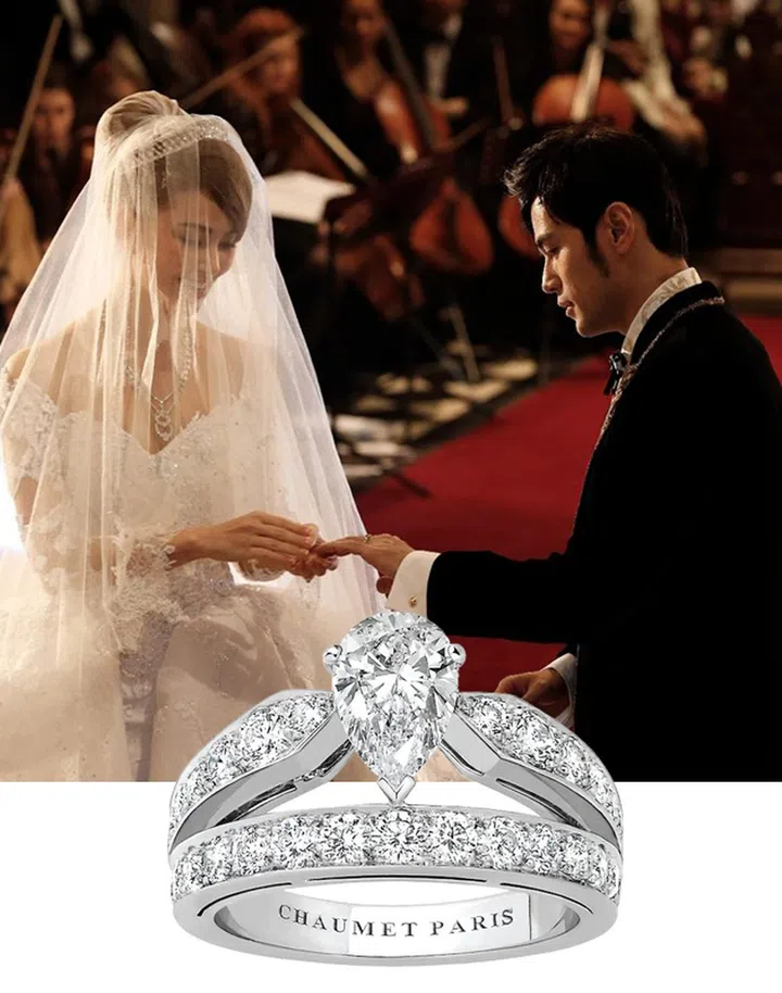 2015年,周杰伦远赴英国在Selby Abbey教堂内举办了一个梦幻的世纪婚礼,昆凌身穿Mikeal D量身定制的蕾丝婚纱,佩戴Chaumet冠冕及钻石项链。虽周董一直没公开婚戒,但昆凌在一次访问中曾透露求婚戒出自Chaumet经典的Josephine系列。