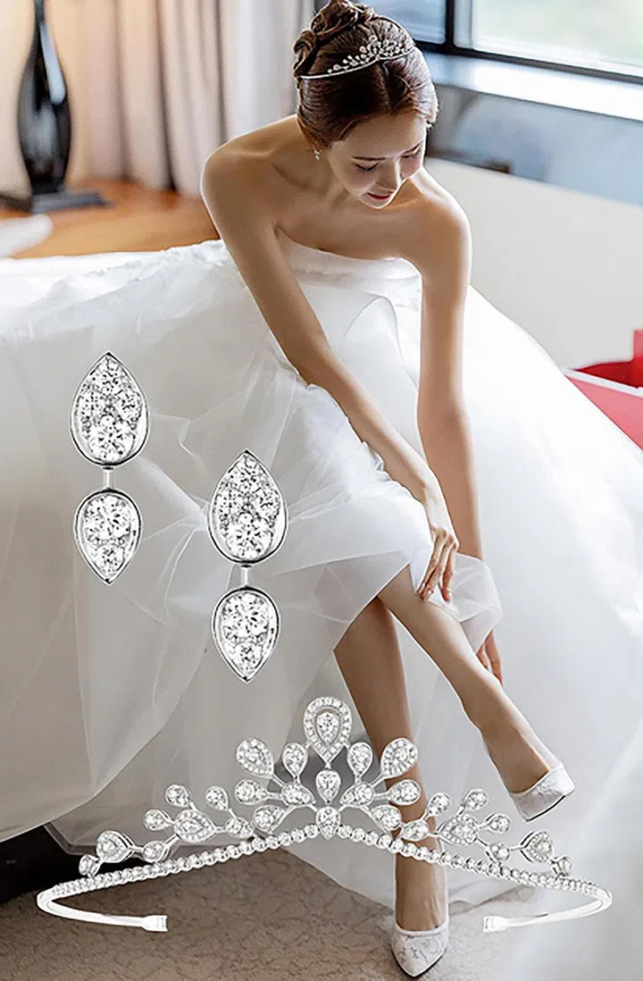 另外,李多海穿着CHARLES & KEITH Bridal系列的Lace & Mesh Pumps搭配婚纱也引发热议。这一造型中,她同样佩戴着Chaumet Joséphine Aigrette Impériale镶钻白金冠冕,并搭配品牌的Joséphine Ronde d'Aigrettes镶钻白金耳坠。