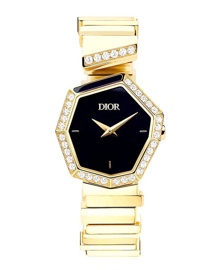 Gem Dior腕表系列,是品牌珠宝艺术总监Victoire de Castellane全新呈献的新作。设计融合Dior高订工艺,致敬 Dior 先生当初为高订时装秀遴选面料时,随手将面料样品固定于纸上而意外呈现的惊艳效果。其棱角分明且层层排列的不对称设计,也犹如矿物地层,旨在展现自然的质朴之美。