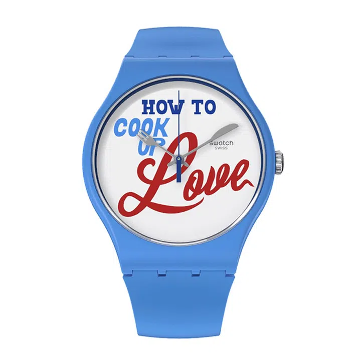 今年Swatch为情人节推出三款新作,包括将食趣融入腕间的Recipe For Love腕表,以及Love To Go Around和Purest Love两款腕表。其中最有趣的,是这款带有九枚表带环的Recipe For Love腕表。上面带有九种“配料”,包括:爱之盛宴(zest of sex appeal)、 爱情魔法(a pinch of magic)、 肆意心动(4 liter of surprise)、 温柔爱抚(spoonfuls of touch)、 心花怒放(spoonfuls of joy)、 浓情蜜意(1 big cup of flirting)、双份幸运(2 large helpings of luck)、柔情之吻(200g of kisses)以及一个小小的厨师帽标志。佩戴者可按需选取,在腕表上亲手为爱“调味”。