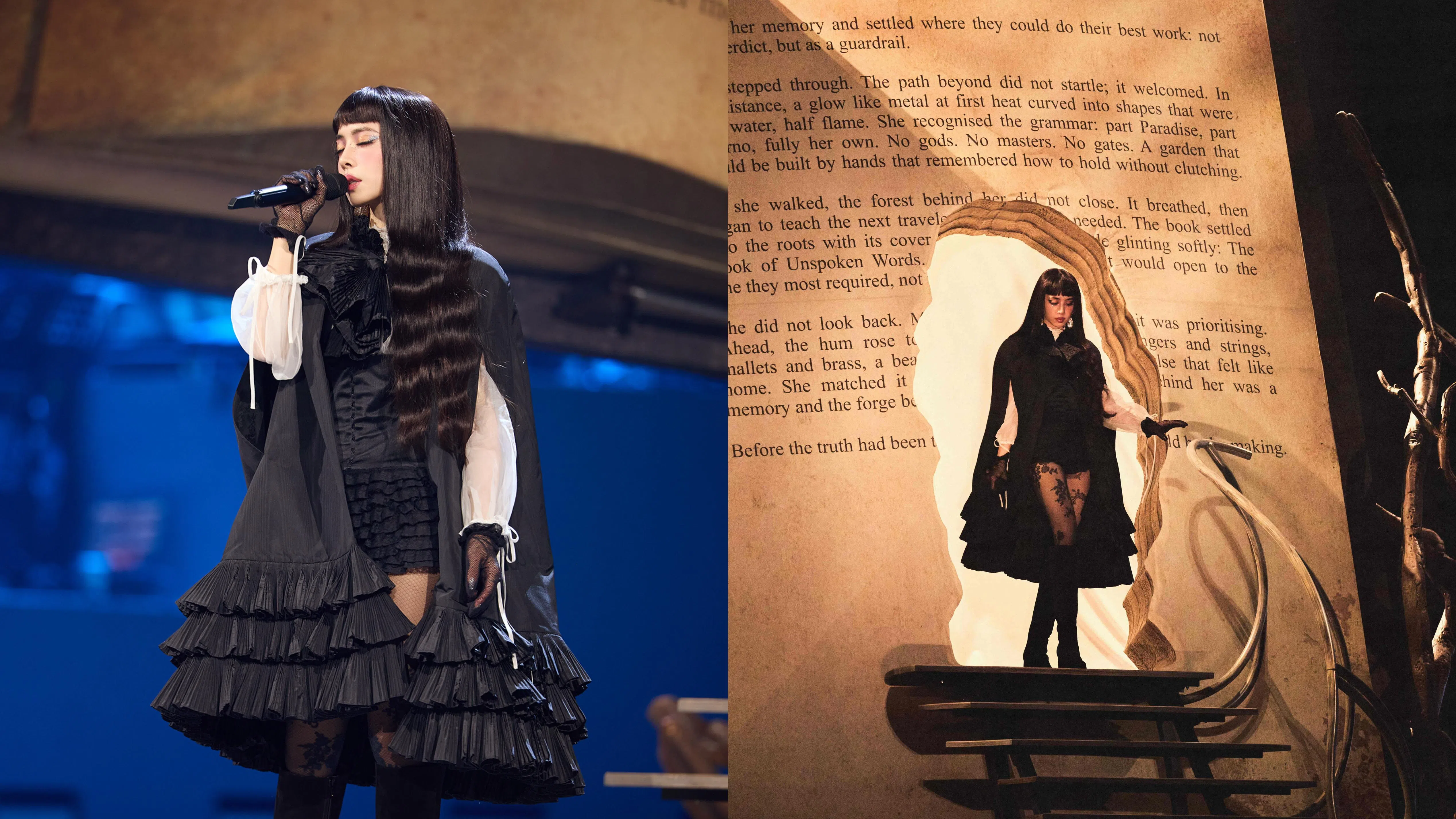 在2026年1月1日的《PLEASURE》世界巡演台北站舞台上,蔡依林(Jolin Cai)身穿Valentino为她打造的黑色定制造型登场。整体轮廓以立体束身上衣与层层堆叠的荷叶边裙摆构成,勾勒出鲜明而戏剧化的舞台线条;轻透白色薄纱袖与深色主体形成强烈对比,在灯光下呈现若隐若现的层次感。造型搭配蕾丝丝袜与长靴,强化下半身比例,也让整体在华丽与力量之间取得平衡。随着舞台灯光与场景转换,服装的结构与材质不断被放大,成为演出视觉叙事中不可忽视的一部分。