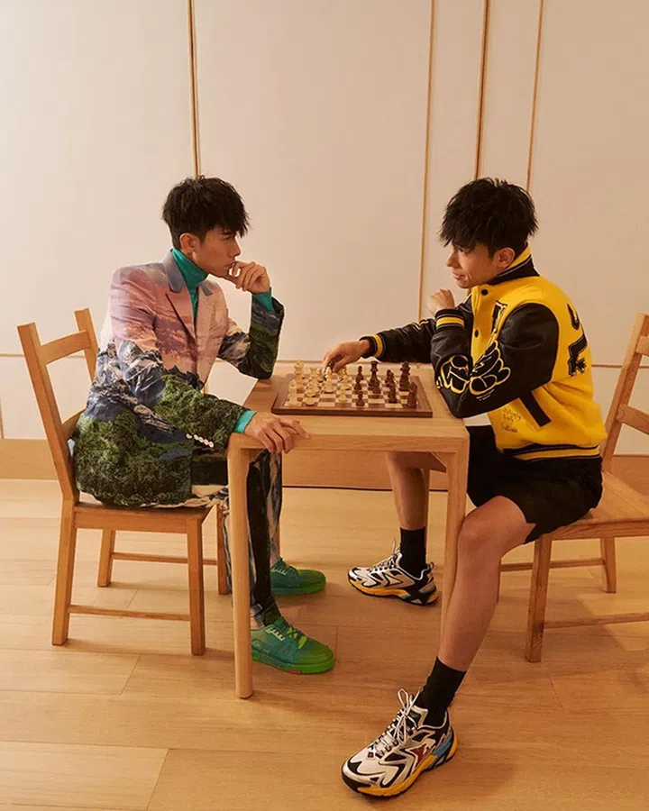 除了王冠逸,好几位男星也参与了这次的创意拍摄。这里的陈炯江,一边是穿着花俏设计的西装(西装外套与长裤是美丽的山水景色印花),搭配亮眼的绿色高领毛衣和运动鞋;右边的陈炯江则是个大男孩,以黄色的学院运动风外套搭配黑色短裤、长袜,演绎出学院校草的青春帅气。