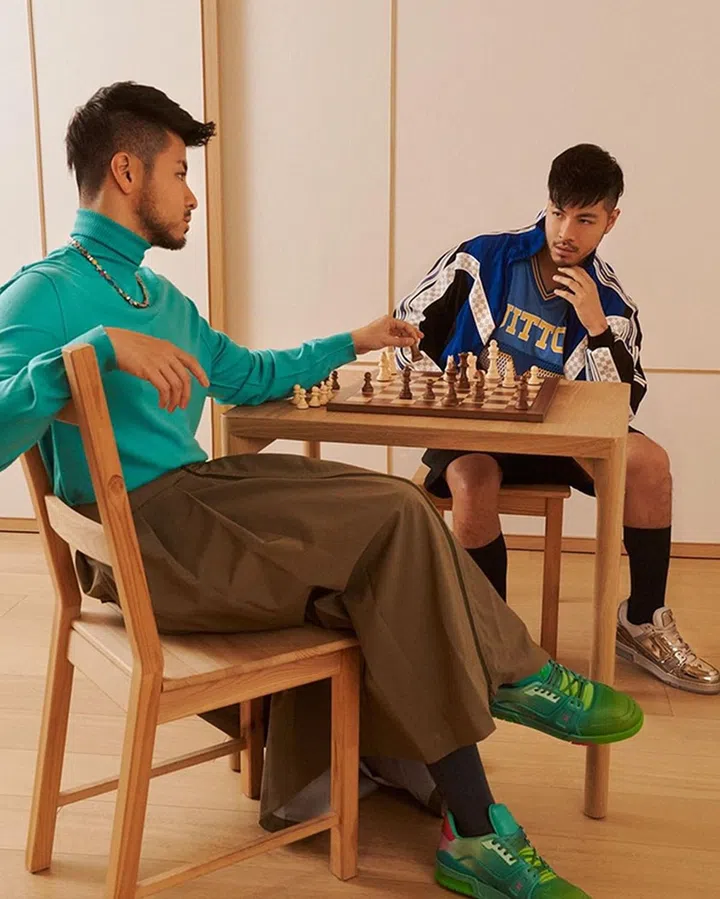 Benjamin Kheng给大众的印象是帅气中带点滑稽、性感中又藏有大男孩的纯真,这两位Benjamin似乎完全表达了住在他内心的自己。坐在左边的Benjamin以男士长裙搭配高领毛衣和运动鞋, 营造出时尚的前卫感;对面的大男孩Benjamin,穿上了学院风运动上衣、外套和短裤,而脚上的高筒长袜更是阳光活力满分。