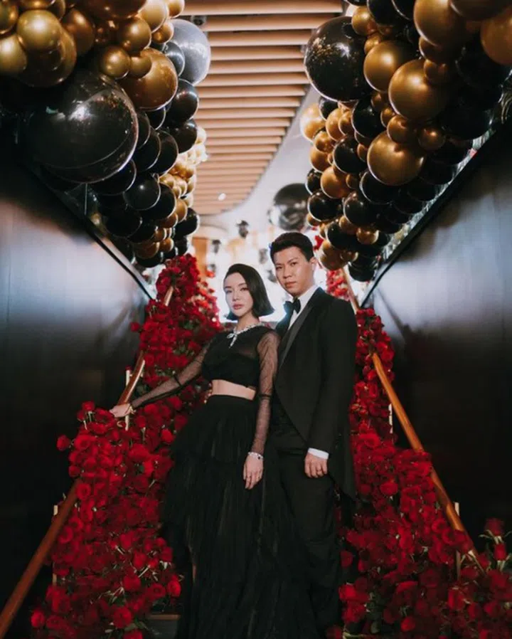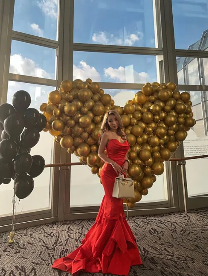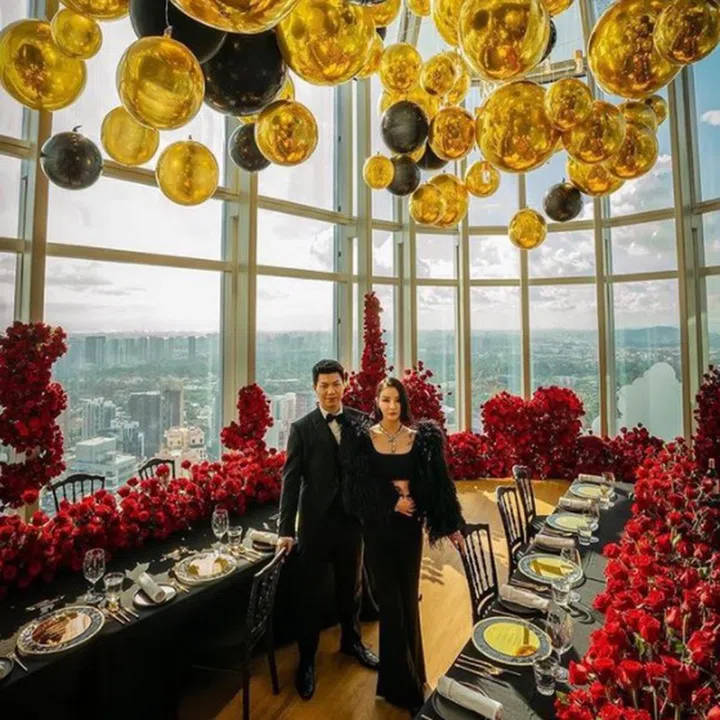 婚宴在ION 55楼的1-Atico举办(本地男星谢俊峰和网红老婆曾敏今年初也在同一地点举办婚宴哦),坐拥无敌的城市天际线景观,黄金日落和璀璨夜景,成为这场婚宴的最佳背景。现场也以15,000个黑色和金色的气球,以及娇艳欲滴的红玫瑰装饰,呼应婚宴的“The Great Gatsby”主题。