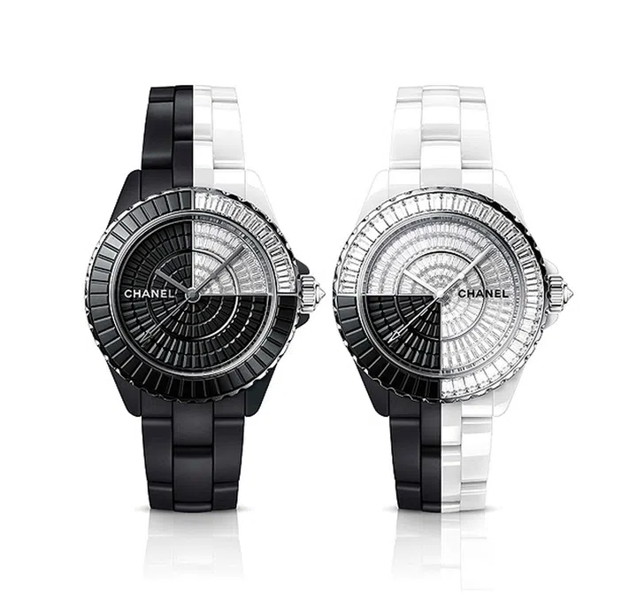 J12系列还推出视觉几何感十足的黑白双色镶钻腕表(上图),以及七枚J12腕表组成的Eclipse表盒套装——从全白,到黑白,到全黑,七枚腕表如白昼逐渐向黑夜交替,独一无二仅套装出售。此外也有表盘镶满钻石的Star Light腕表,及镂空设计的Diamond Tourbillon陀飞轮腕表和X-Ray Star腕表等,以超多丰富设计尽情演绎J12的创意可能。