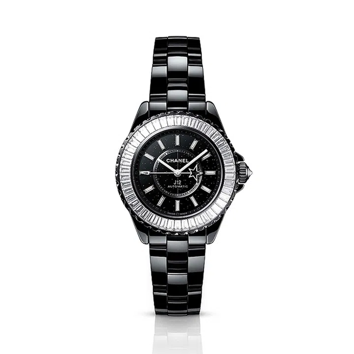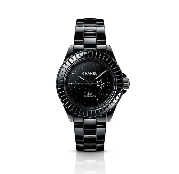 J12 Night Star镶钻腕表推出38mm 与33mm表径款式(各限量发售55枚),每一表款均设计以黑色闪耀效果表盘,并有一颗“彗星”恒久转动。