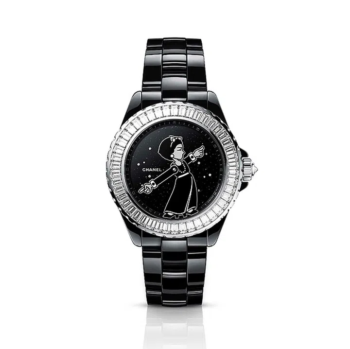 身穿黑色晚装的Chanel女士为你“指示”时间的俏皮腕表——搭载Caliber 12.1自动上链机械机芯,除装饰醒目钻石表圈,表盘上也有钻石闪耀,犹如夜空中的星辰。