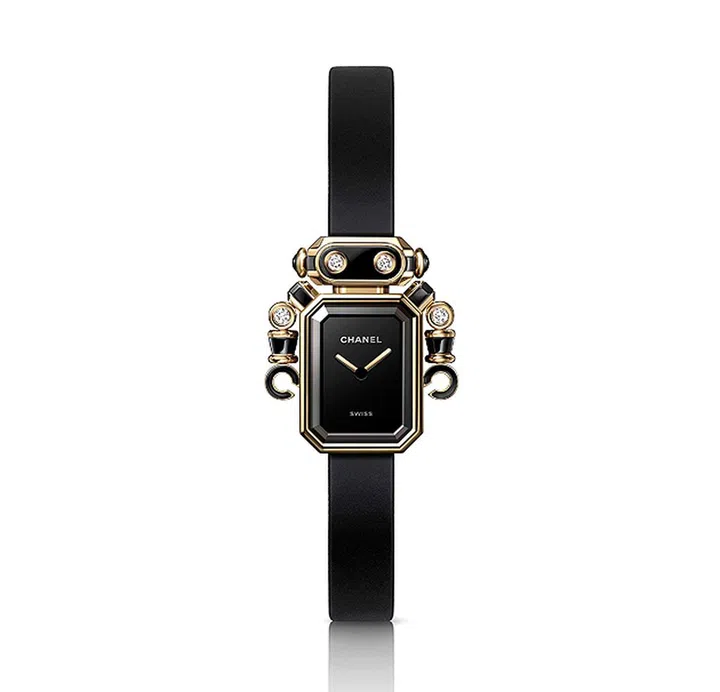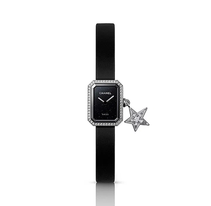 该腕表采用砂金石闪耀效果的黑色漆面表盘,表圈镶嵌钻石并装饰一个彗星形的镶钻精钢幸运缀饰,让Première腕表犹如戴了一只耳坠般个性十足。