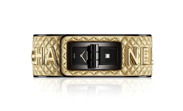 风格大胆出挑的金色菱格纹绗缝皮革表带腕表,表带上还装饰有鲜明“CHANEL”品牌标志。腕表拥有两个黑色漆面表盘,其中一个表盘镶嵌1颗公主型切割钻石,显时表盘则采用简约金色指针设计。