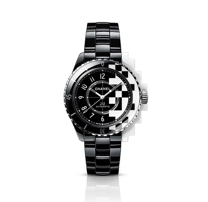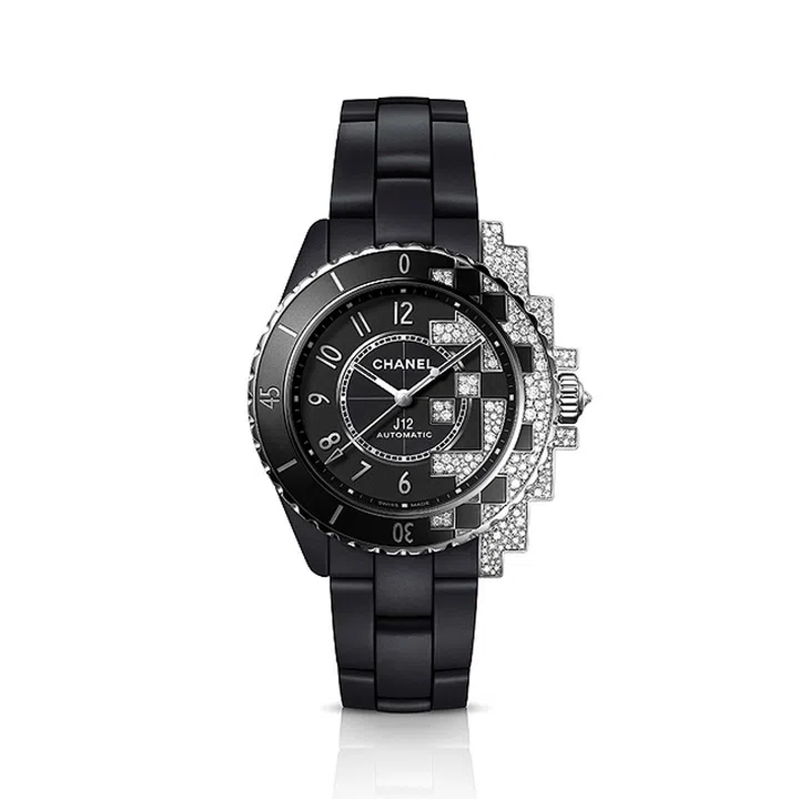 品牌以几何设计演绎的J12新表。在精密陶瓷表壳上切割出镶嵌钻石的像素化图形,与黑色表圈和表盘形成鲜明对比。