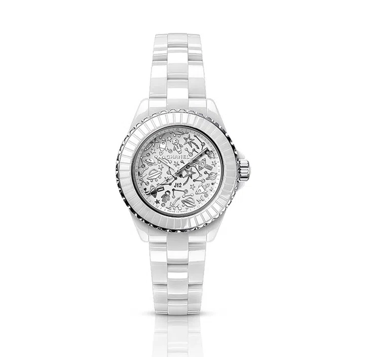 另外,品牌对J12纯白款腕表的演绎,则是在夜光涂层表盘上装饰如宇宙般的图形,并将12颗钻石巧妙融入表盘上的星象符号及图案。