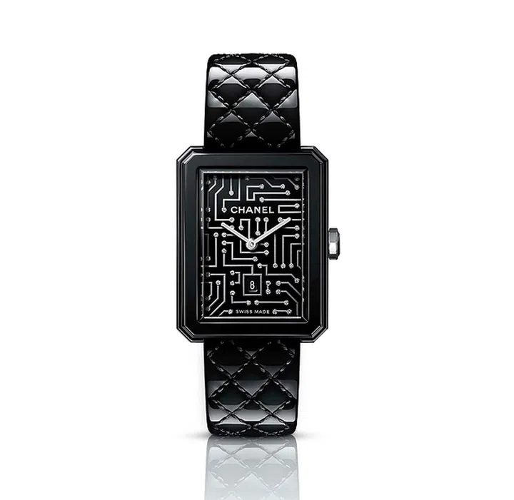 表盘造型好似迷宫?其实是印制电路图案(并镶嵌钻石)。腕表配备黑色漆面菱格纹绗缝皮革表带,外加银色衬里,从内而外散发炫酷气息。