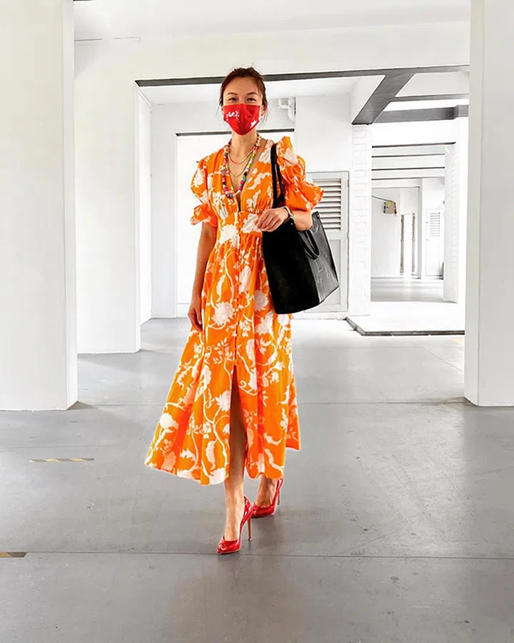 同样爱穿印花装的白薇秀,新年选择了大胆的橙色花卉连衣裙,并搭配红色高跟鞋和红口罩。和家人一起享用素食并去牛车水看灯会,度过了一个温馨的农历新年。