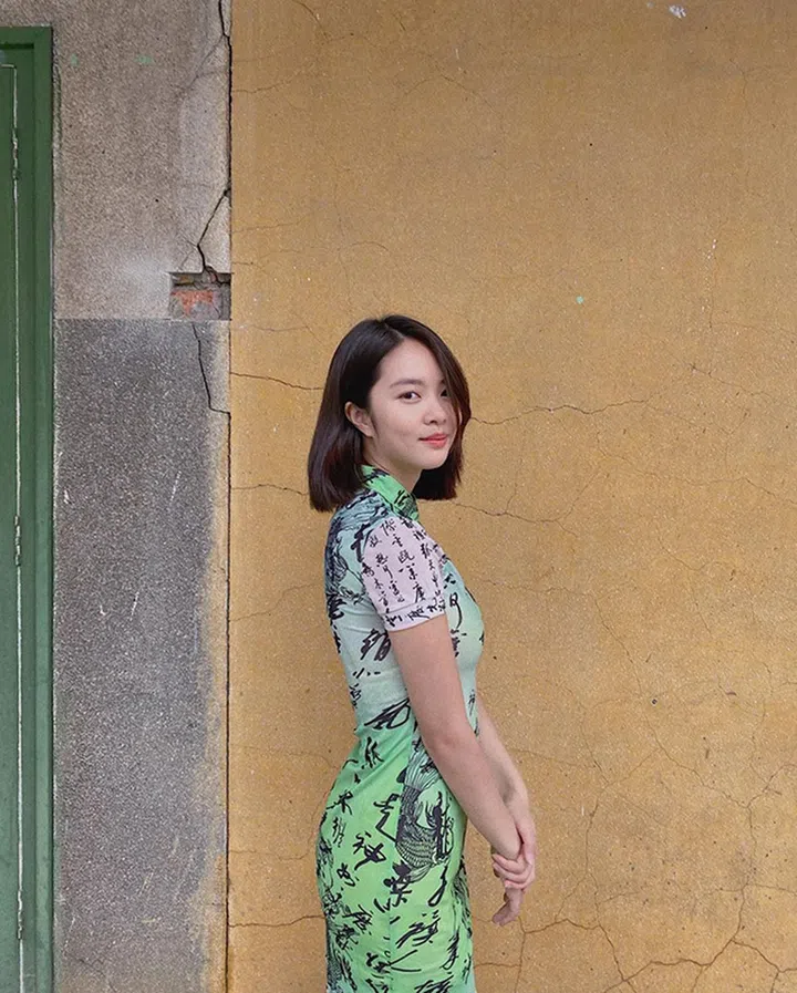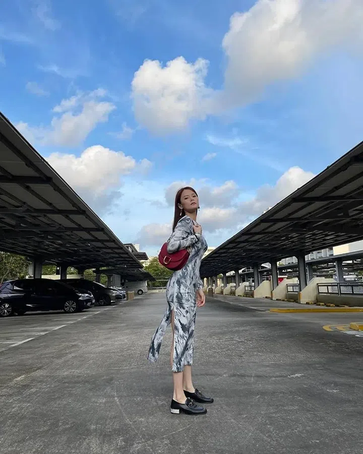 Jayley的开衩连衣裙远看好像旗袍,其实近看是一件抽象印花连衣裙。她搭配Charles & Keith的红色肩袋及Gucci乐福鞋,耳坠和戒指还是“麻将”设计,造型好好玩。