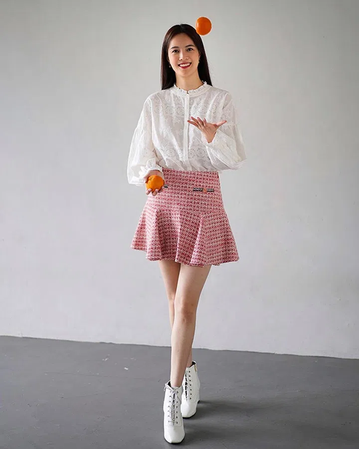 Tay Ying新年穿着浪漫柔美的白色镂空上衣,搭配红色短裙秀出修长美腿(服装来自Maje),再用白靴做呼应,造型简约又有“年味”。另外,刘子绚新年时也穿的是类似的白色镂空上衣。