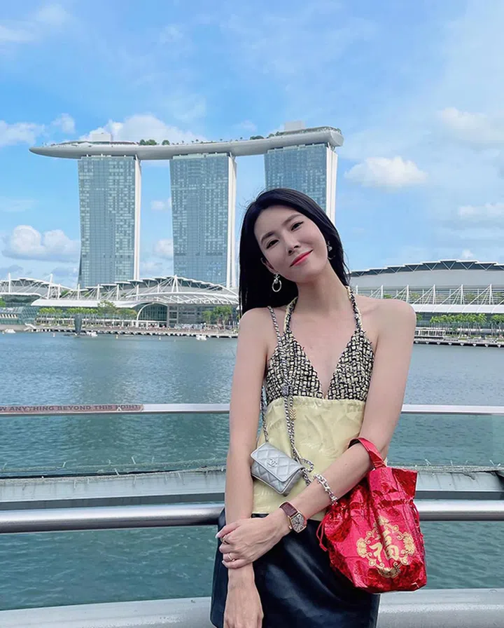 黄思恬这款Chanel迷你链式腰袋,早前她也曾用来搭配极简黑色造型。这次过新年她穿着清凉的浅黄吊带,在户外拍照超性感。
