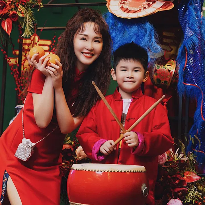 范文芳新年和儿子以亲子装亮相跟大家拜年。她还以Chanel迷你包搭配纯红旗袍,背后的舞狮也是独特的蓝色调,画面色彩丰富又有冲击力,可谓仪式感满满。