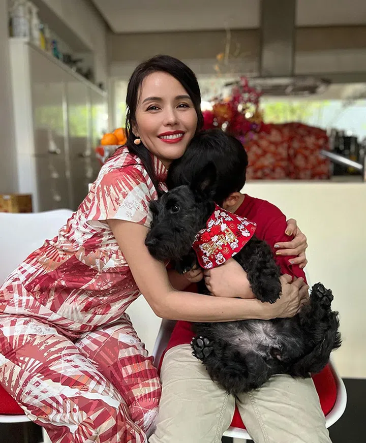 阿姐是3个儿子的母亲,今年还恰好是三儿子蒋Nathan(2010年出生)的本命年。她穿着红色旗袍连衣裙“搂着小老虎”,还调侃属羊的自己是“送羊入虎口”,“娘心满满的幸福”。