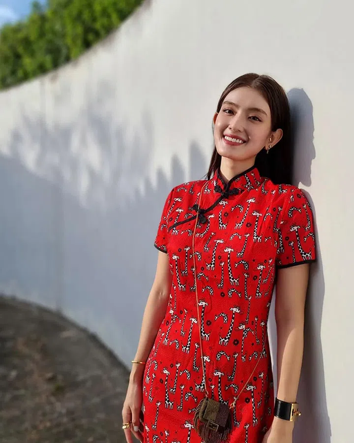 洪凌新春连穿三件红,有Guess的性感连衣裙,也有和男友Nick一起穿的Balenciaga情侣衫。其中大年初一穿着印有长颈鹿图案的现代旗袍,搭配Fendi的迷你小包,打造时尚拜年造型。
