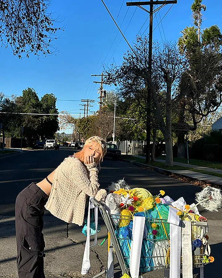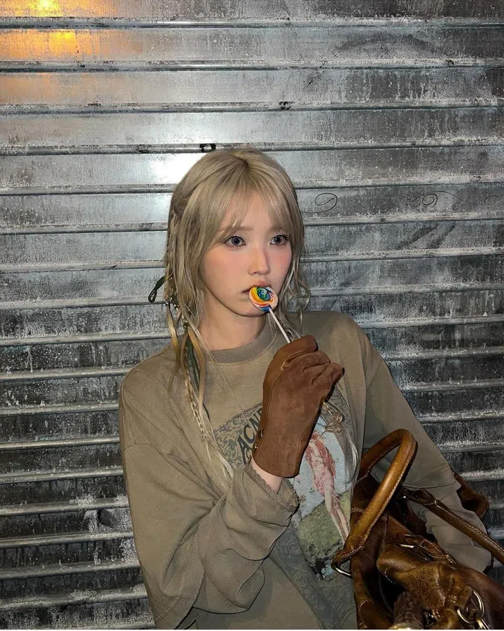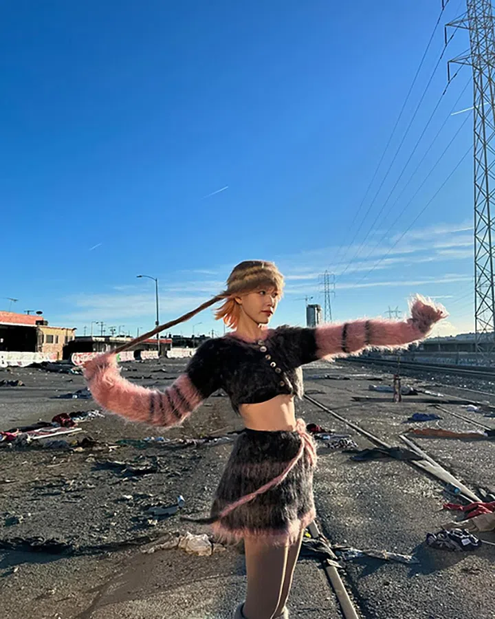 IU另一主打曲《Holssi》,IU找来NewJeans成员Hyein和Roller Coaster主唱赵元善助阵。同时IU也在MV中演绎多个阳光造型,并大秀腹肌。她分享,“Holssi”的意思是“孢子”(蒲公英种子),因她小时候以为不管什么花最终都会开花结果,但到了30岁,她认为并不是所有人都非要开花,而更想像蒲公英种子一样无拘无束,自由快乐。上图这身软糯的造型,来自泰裔美国夫妇创办的针织品牌Nong Rak,并搭配了针织帽和袜套。