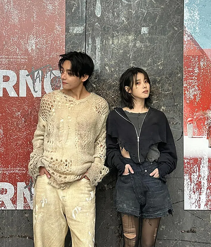 在《Love Wins All》中被智慧体“箱子”追杀的两人,一人单眼失明,一人不能说话,在拾到的DV机内,看到了彼此安然完好的模样和过去灿烂的光景。两人在逃亡的过程中,IU穿着Sami Miro Vintage的连冒汗搭R13磨边牛仔短裤;金泰亨穿Our Legacy钩编针织衫和R13的宽松牛仔裤,以grunge风范演绎“末日时尚”。