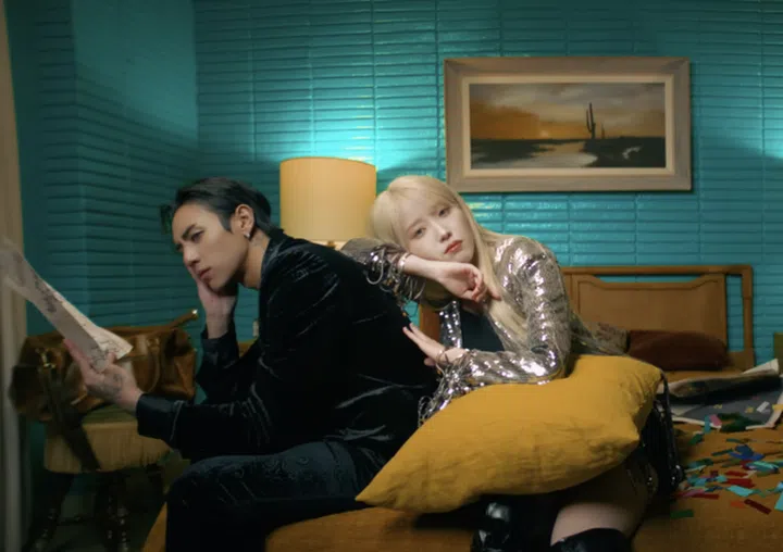 执导该MV的导演,也是身兼男主角的 DPR IAN(本名叫Christian Yu),这次第一次和IU合作,其中两人在车上的那一幕最让人忍俊不禁——IU在拍卖会上盗取“球棒”后,快速变装逃离,并用棒棒糖向他“劫车”。没错,用棒棒糖。仿佛在说:“快开车!再不开我就甜死你!!”而IU身上这款假两件式的宽松套衫,来自Acne Studios。