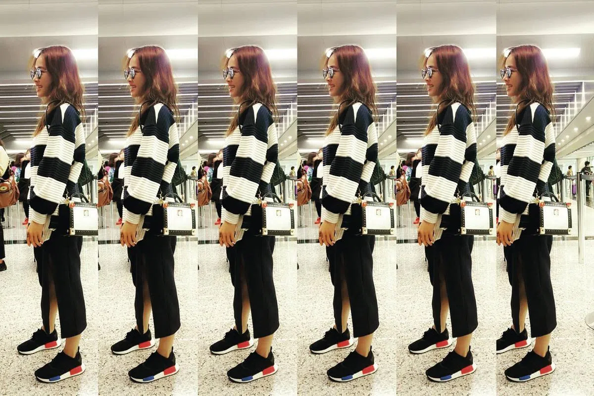 搭飞机有什么比一双轻便且舒适的球鞋更重要?亚洲天后蔡依林现身机场的monochrome黑白airport look看似休闲及effortless,但细看其实也经过了一番搭配,NMD鞋底的蓝及红色块是整体造型的亮点,有画龙点睛的效果。