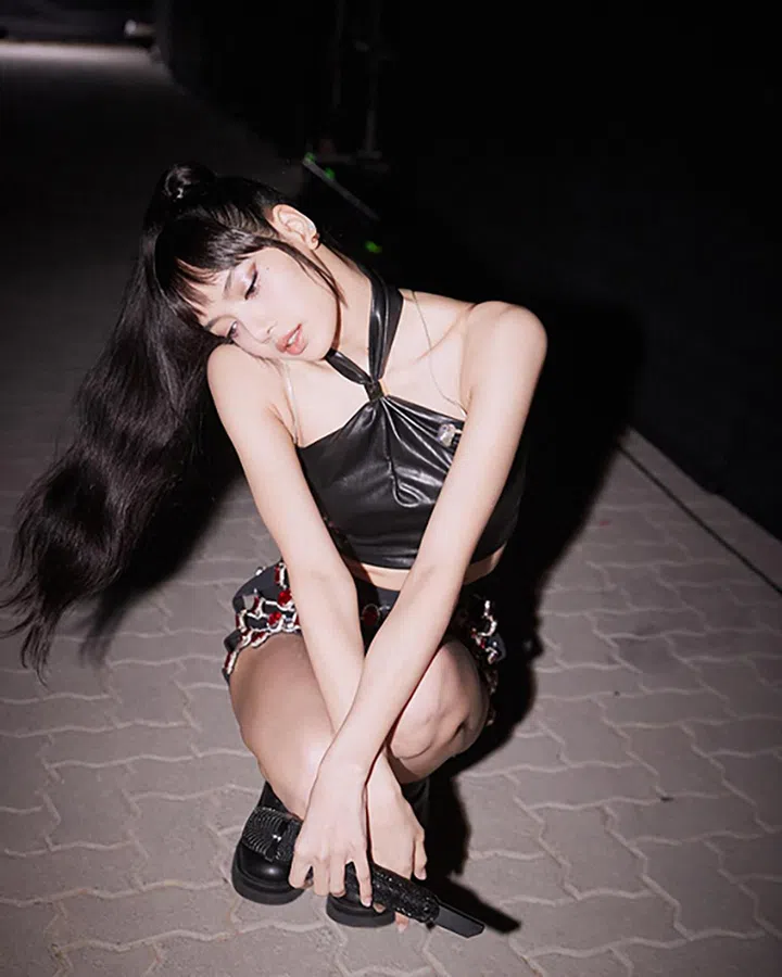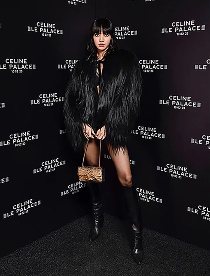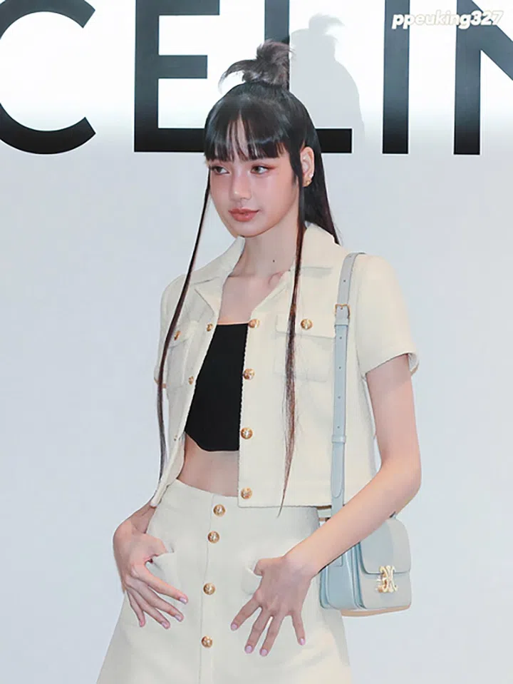 Lisa出席Celine首尔快闪店活动,穿着品牌crop top及迷你裙套装,内搭crop top胸衣,并携带Teen Triomphe皮革肩袋。另外Lisa高跟凉鞋搭黑袜的方式,也让造型更有运动活力。