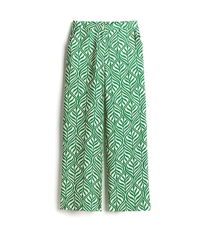想要风格轻松,穿搭不费脑筋,也可用各种简约上衣搭配图案抢眼的宽松度假风长裤。上图这款充满绿意的轻薄人造丝长裤,既能陪你逛街走巷,又能在烈日炎炎的海边给人带来一抹清凉。