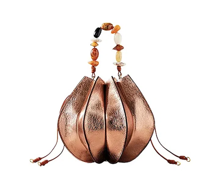这款Lotus提袋,拥有袋精细褶皱的独特轮廓,灵感来自陶艺家Ursula Morley-Price的作品。手袋采用玫瑰金色皮革,并配有束口系带和珠饰提手,造型意趣十足。