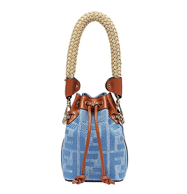 袋身装饰FF图案的牛仔束口水桶袋,提手采用编织造型——“反客为主”的粗手柄,为小巧手袋制造更多反差美感。