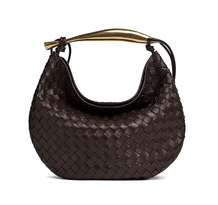 Intrecciato编织皮革,是体现Bottega Veneta历史和工艺的代表性元素。这款Sardine手袋,采用柔软的皮革条编织而成,悬挂在雕塑感十足的金色提手上,造型极具艺术效果。