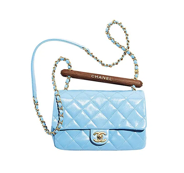 浅蓝色羊皮翻盖手袋,在标志性皮革及金属包链上装饰点缀CHANEL标志字样的木质横条,融合一丝异域气息,令设计更显独特。