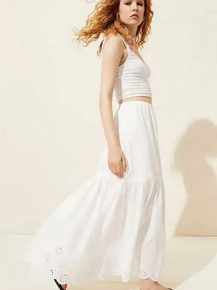 带细剪孔绣(Broderie Anglaise)设计的宽大白裙,风格轻松浪漫,极具度假气息。无论是在resort度假还是去海边,各种服装都能搭配,而且也让你在室外感觉舒适凉爽(长裙还防晒哦)。