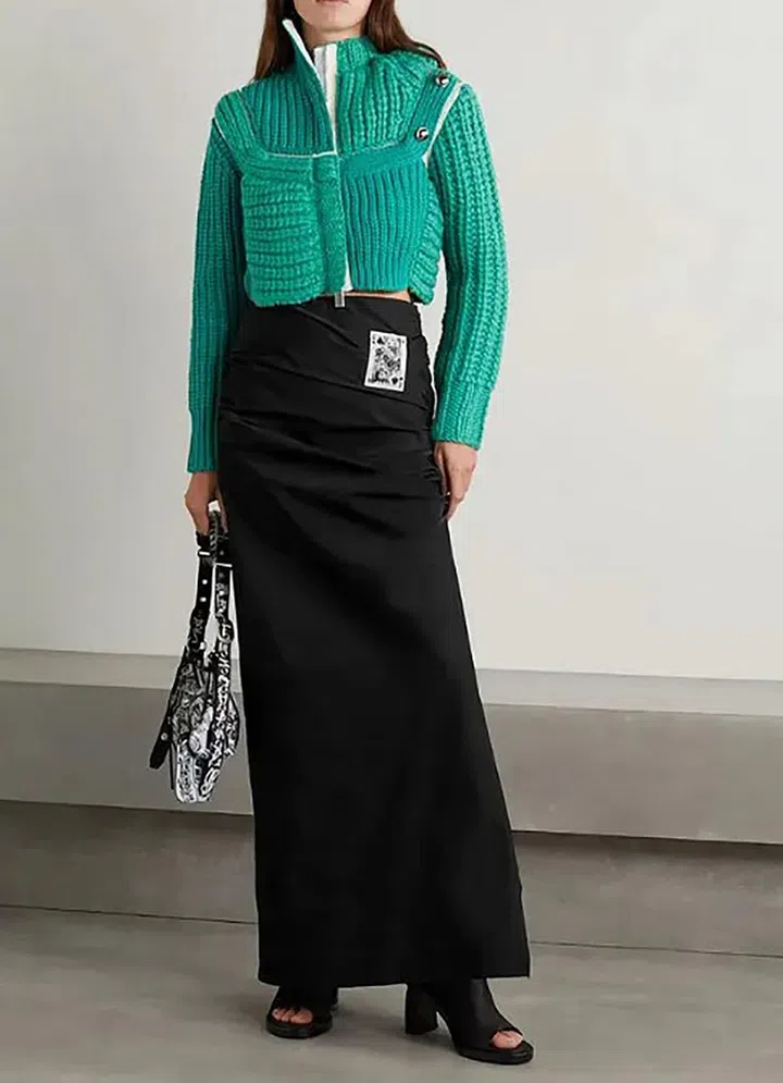 在侧面开叉的MM6 Maison Margiela长裙,采用褶饰打造立体感造型,腰部装饰扑克牌设计——而且还让Queen和King融于同一黑桃牌面,造型俏皮有趣。
