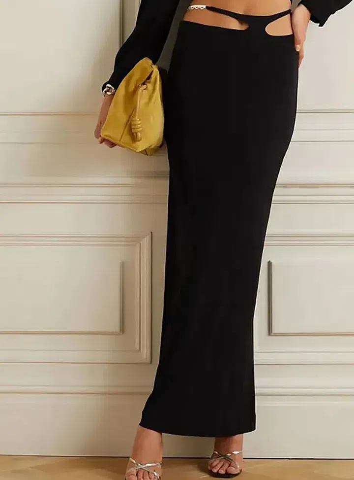 腰部带cut-out设计的贴身开叉长裙,两侧的不对称“挖洞”还装饰有金属硬饰,如腰链般为你增添更多性感魅力。可搭配品牌相应设计的短版系带上衣。
