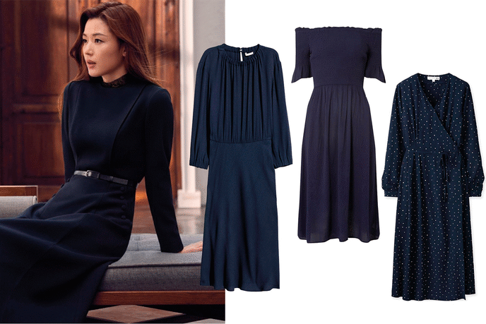 相比经典的全黑连衣裙,深蓝更多了一股清新与温柔。女友们赶快借鉴全智贤的穿搭法吧!