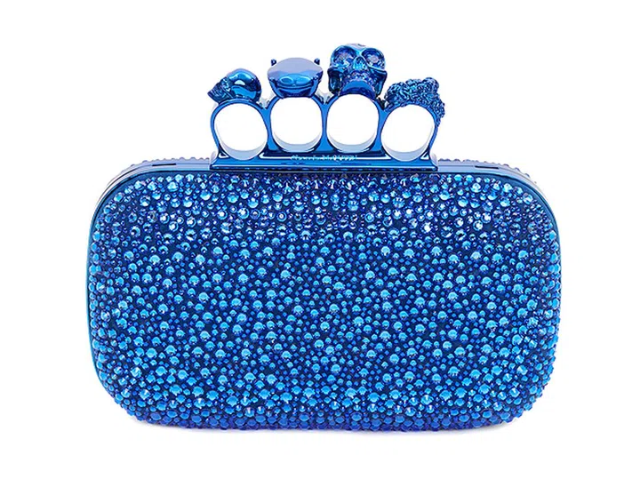 高级蓝色水晶饰以Alexander McQueen狂野的Skull Four Ring手拿包上,以水晶的精致华丽感碰撞品牌的非主流路线,营造突兀又前卫的时尚风格,这款手拿包是时尚先锋者的必配“盔甲”。