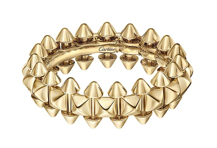 (From top) CARTIER Clash de Cartier, pink gold small ring $3,650pink gold XL bracelet $56,000pink gold medium ring $5,000pink gold double-row ring $6,150white gold medium bracelet $15,600 (图 Cartier)