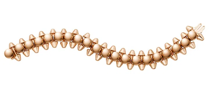 品牌融合五金和珠子元素,将铆钉与尖钉(clous carrés)两大经典符号重新演绎,打造出既硬朗又不失优雅的设计(早在庞克风尚未崛起的1920年代,Cartier便已将这些“尖钉”元素融入珠宝与腕表创作)。如品牌于1925年亮相巴黎国际装饰艺术及现代工艺博览会时所展出的一款由两朵抽象兰花组成的发饰——除了镶钻还点缀缟玛瑙铆钉,展现了极致的工艺和创意。在Jeanne Toussaint(1933至1970年间的品牌首饰设计部门掌舵人)的创意领导下,Cartier进一步发展这一设计语言,以锥形凸圆宝石点缀球形结构赋予首饰独特且不羁的立体感,继而成为品牌美学的重要标志。
