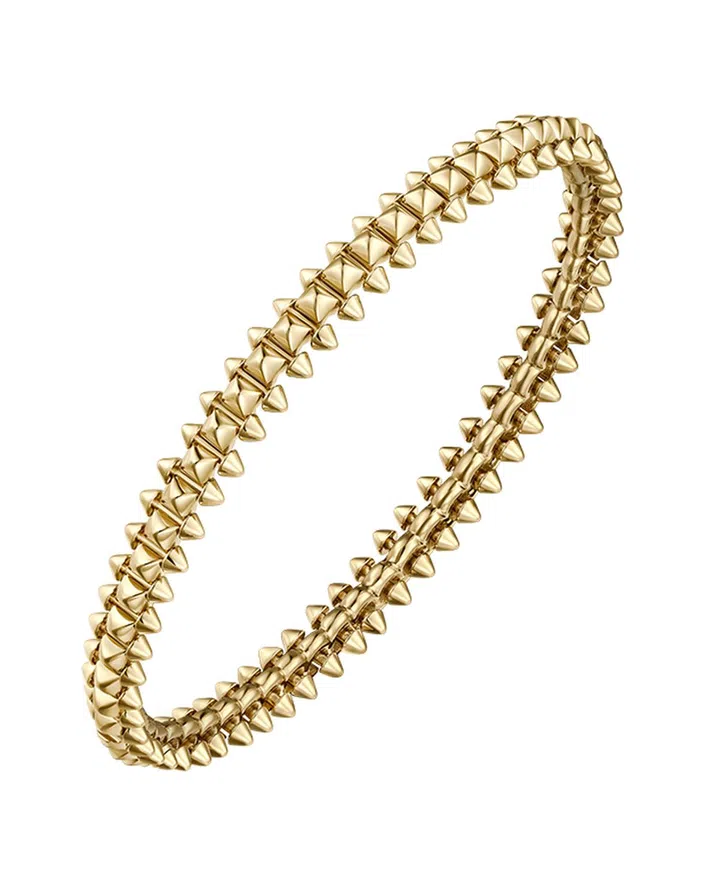 2022年品牌对系列圆珠与铆钉元素进行了放大处理,方形饰钉的数量也加倍升级,视觉冲击更强烈。2023年系列再度被注入新意,将铆钉与方形饰钉以双排形式排列,赋予作品全新触感。同时,方形饰钉的每个截面均铺镶钻石,使作品从任何角度看都能折射璀璨光芒,尽显精湛工艺。