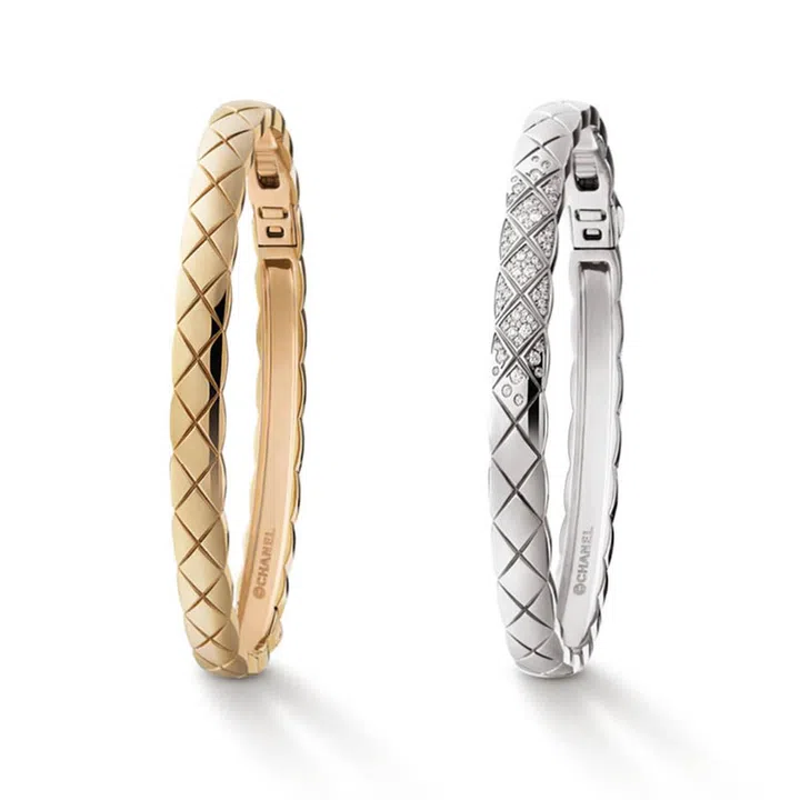 以品牌标志性的菱格纹为设计灵感的Coco Crush系列,将它刻画在首饰上,简约中不失时尚个性!情侣手镯也可以选择不同材质,黄金+白金也很有爱!另外,品牌也有超适合叠戴的mini版,及新推出的手链款式。