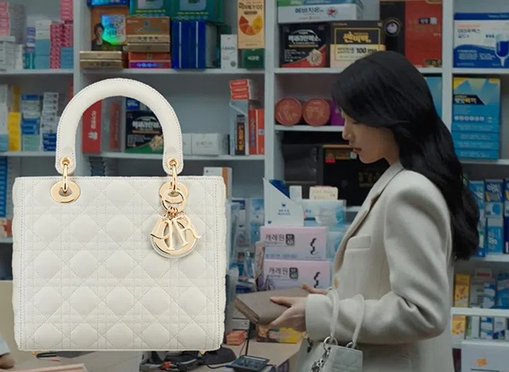 拥有经典Cannage绗缝设计的Lady Dior手袋,是品牌优雅美的象征。女主在剧中用它搭配粉色衬衣及HANAVO米白色大衣,所使用的米色调钱夹也是Lady Dior系列。