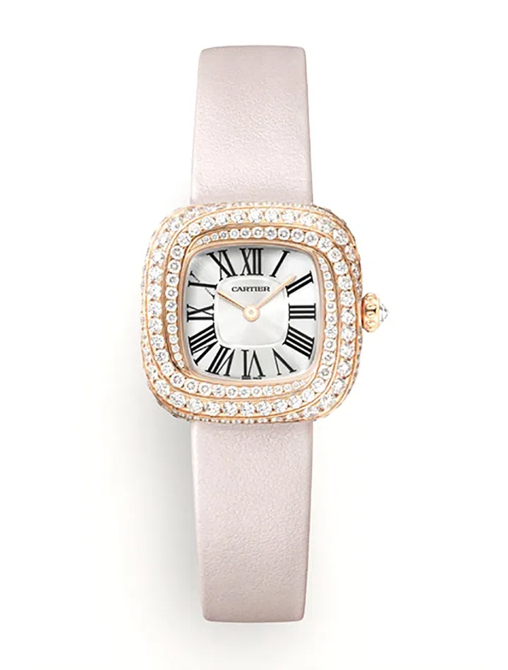 品牌的Coussin de Cartier女表系列,Coussin——在法文意即“抱枕”,而圆润的枕形表壳就是此系列的设计焦点。另外,此次系列的一大工艺亮点,是创新采用三角形镶嵌(triangular setting)工艺——即无需借助传统珠粒(grain setting)便可将钻石直接镶于表壳,从而让金属遁形凸显钻石的光芒,散发出浓重的奢华感。