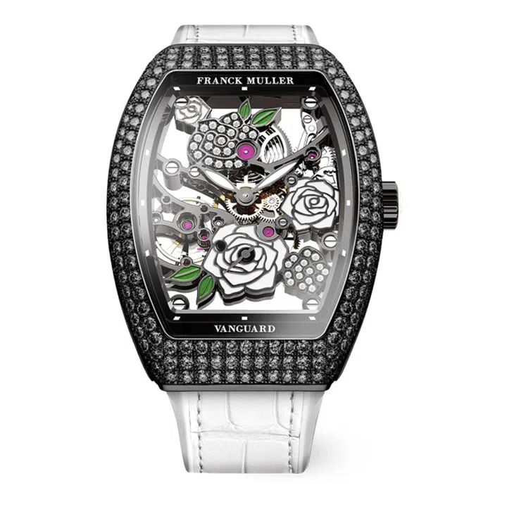 FRANCK MULLER Vanguard Rose Skeleton Black Diamonds搭载手动上链机械机芯、镶黑色钻石黑色PVD涂层18K白金表壳、鳄鱼皮表带镂空腕表 (价格未定)